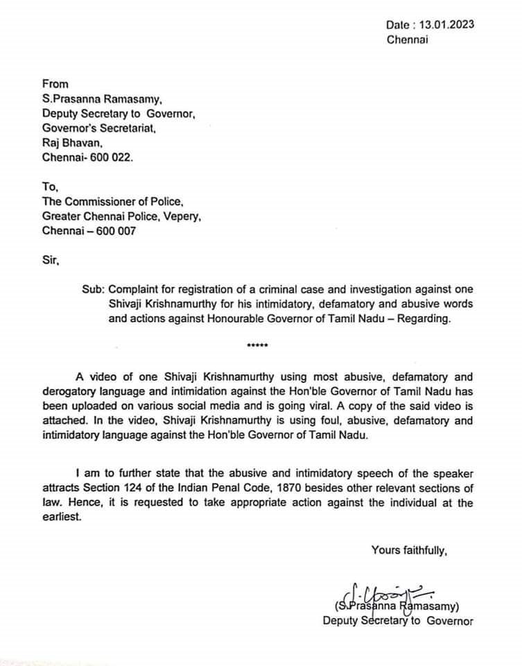 கவர்னர் பற்றி அவதூறூக பேசிய திமுக பேச்சாளர் சிவாஜி கிருஷ்ணமூர்த்தி மீது கவர்னர் மாளிகை புகார் : விருகம்பாக்கத்தில் நடந்த கூட்டத்தில் கவர்னர் பற்றி அவதூறாகவும், மிரட்டல் விடுத்து பேசியதாகயும் துணை செயலாளர் பிரச்சன்னா ராமசாமி புகார்