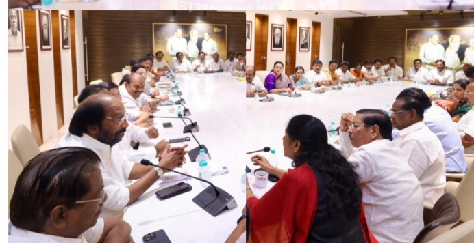 இன்று சென்னை அண்ணா அறிவாலயத்தில், திமுக எம்பி களுடன் தமிழக முதலமைச்சரும் திமுக தலைவருமான மு க ஸ்டாலின் தலைமையில் முக்கிய கூட்டம் நடந்தேறியது. இக்கூட்டத்தில் , வரவிருக்கும் நாடாளுமன்ற குளிர்கால கூட்டத் தொடரில் எழுப்பப்பட வேண்டிய பிரச்சனைகளை இறுதி செய்வதற்காக இக்கூட்டம் கூட்டப்பட்டுள்ளது. தமிழகத்திற்கு முக்கியத்துவம் வாய்ந்த பிரச்சினைகள் குறித்து இக்கூட்டத்தில் விவாதிக்கப்பட்டது. அதன்படி, கோவை மற்றும் மதுரையில் முன்மொழியப்பட்ட மெட்ரோ ரயில் திட்டங்களை மறுபரிசீலனை செய்து ஒப்புதல் அளிக்குமாறு மத்திய அரசை வலியுறுத்த வேண்டும் என்கிற தீர்மானத்தோடு மத்திய அரசு பாரபட்சமாக செயல்படுவதையும் உணர்த்த வேண்டும் என்பதாகவும் மழையால் பாதிக்கப்பட்ட விவசாயிகளின் நலன்களை பாதுகாக்க நெல் கொள்முதலுக்கான ஈரப்பத வரம்பை 17 விழுக்காட்டில் இருந்து 22 விழுக்காடாக அதிகரிக்க வேண்டும் என்ற கோரிக்கையும் நாடாளுமன்ற உறுப்பினர்கள் எழுப்ப வேண்டும் என்றும் மகாத்மா காந்திஜி தேசிய ஊரக வேலைவாய்ப்பு உத்தரவாத சட்டம் மற்றும் செம கிராசிக்ஷா திட்டம் உள்ளிட்ட தமிழ்நாட்டிற்கு நிலுவையில் உள்ள நிதியை விறுவிறுப்பது தொடர்பான பிரச்சனைகளையும் எழுப்ப வேண்டும் என்பதாகவும் மாநில சட்டமன்றதால் நிறைவேற்றப்பட்ட மசோதாக்களை ஆளுநர்கள் நிறைவேற்ற ஒரு குறிப்பிட்ட காலக்கெடு தேவை மற்றும் சர்சைக்குரிய எல்லை நிர்ணய பிரச்சனை ஆகியவை எழுப்ப வேண்டிய முக்கிய பிரச்சனைகளாக பேசப்பட்டது தமிழக மீனவர்கள் அடிக்கடி கைது செய்யப்படுவது மற்றும் பிற நாடுகளால் அவர்களின் படகுகள் ஏலம் விடப்படுவது உள்ளிட்ட அவர்கள் எதிர் கொள்ளும் பிரச்சனைகளுக்கு நிரந்தர தீர்வு காண வேண்டியதன் அவசியத்தையும் இக் இக்கூட்டத்தில் எடுத்துரைக்கப்பட்டது. இக்கூட்டம் நிறைவுற்ற பின்பு திமுக துணை பொதுச்செயலாளர் கனிமொழி கருணாநிதி மற்றும் செய்தி தொடர்பாளர் டி கே எஸ் இளங்கோவன் உள்ளிட்ட தலைவர்கள் நிறைவேற்றப்பட்ட தீர்மானங்களையும் நாடாளுமன்றத்தில் மாநில உரிமைக்காக போராடுவதற்கான கட்சியின் ஒருங்கிணைந்த நிலைப்பாட்டையும் தெரிவித்தனர்.