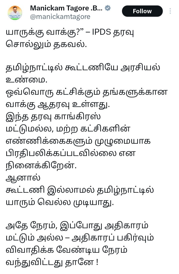 அதிகார பகிர்வு கேட்க வேண்டிய நேரம் இது -காங்கிரஸ் எம்பி மாணிக் தாகூர் எக்ஸ் தளத்தில் கருத்து பதிவு