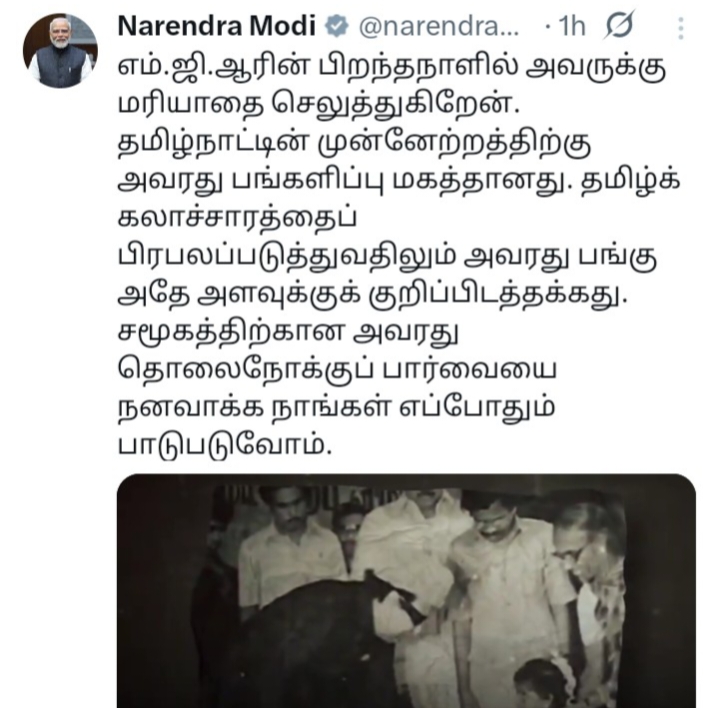 எம்ஜிஆரின் பிறந்தநாளில் அவருக்கு மரியாதை செலுத்துகிறேன் - பிரதமர் நரேந்திர மோடி