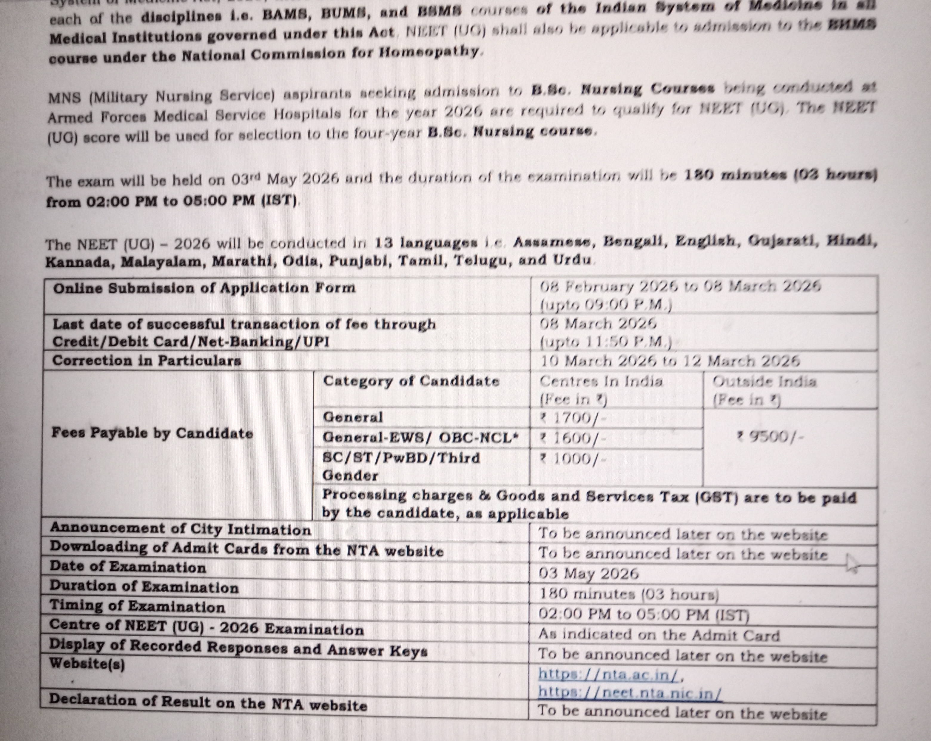 2026 ஆம் கல்வி ஆண்டிற்கான இளநிலை மருத்துவ படிப்புகளுக்கான விண்ணப்ப பதிவு தேசிய தேர்வு முகமையால் இன்று வெளியிடப்பட்டுள்ளது. தகுதி உள்ள மாணவர்கள் ஆன்லைனில் விண்ணப்பிக்கலாம். நீட் அதிகாரப்பூர்வமான இணையதளத்திற்கு சென்று நீயும் ரிஜிஸ்ட்ரேஷன் என்பதை கிளிக் செய்து விவரங்களை பூர்த்தி செய்து விண்ணப்பையன் மற்றும் கடவுச்சொல்லை உருவாக்கி தனிப்பட்ட விபரங்கள் கல்வித் தகுதி மற்றும் தேர்வு மைய விருப்பங்களை பதிவேற்றம் செய்யவும். புகைப்படம் மற்றும் கையொப்பம் ஆகியவற்றை பதிவேற்ற வேண்டும் விண்ணப்ப கட்டணத்தை செலுத்தி பருவத்தை சமர்ப்பிக்க வேண்டும். மாணவர்கள் தாங்கள் பதிவேற்றிய விவரங்களோடு கூடிய விண்ணப்ப படிவத்தை நகலெடுத்துக் கொள்வது நல்லது. இன்று பிப்ரவரி 8ஆம் தேதியிலிருந்து விண்ணப்பம் பதிவு செய்து கொள்ளலாம். விண்ணப்பத்தை பூர்த்தி செய்து கொள்ள கடைசி தேதி மார்ச் எட்டாம் தேதி நிர்ணயிக்கப்பட்டுள்ளது.