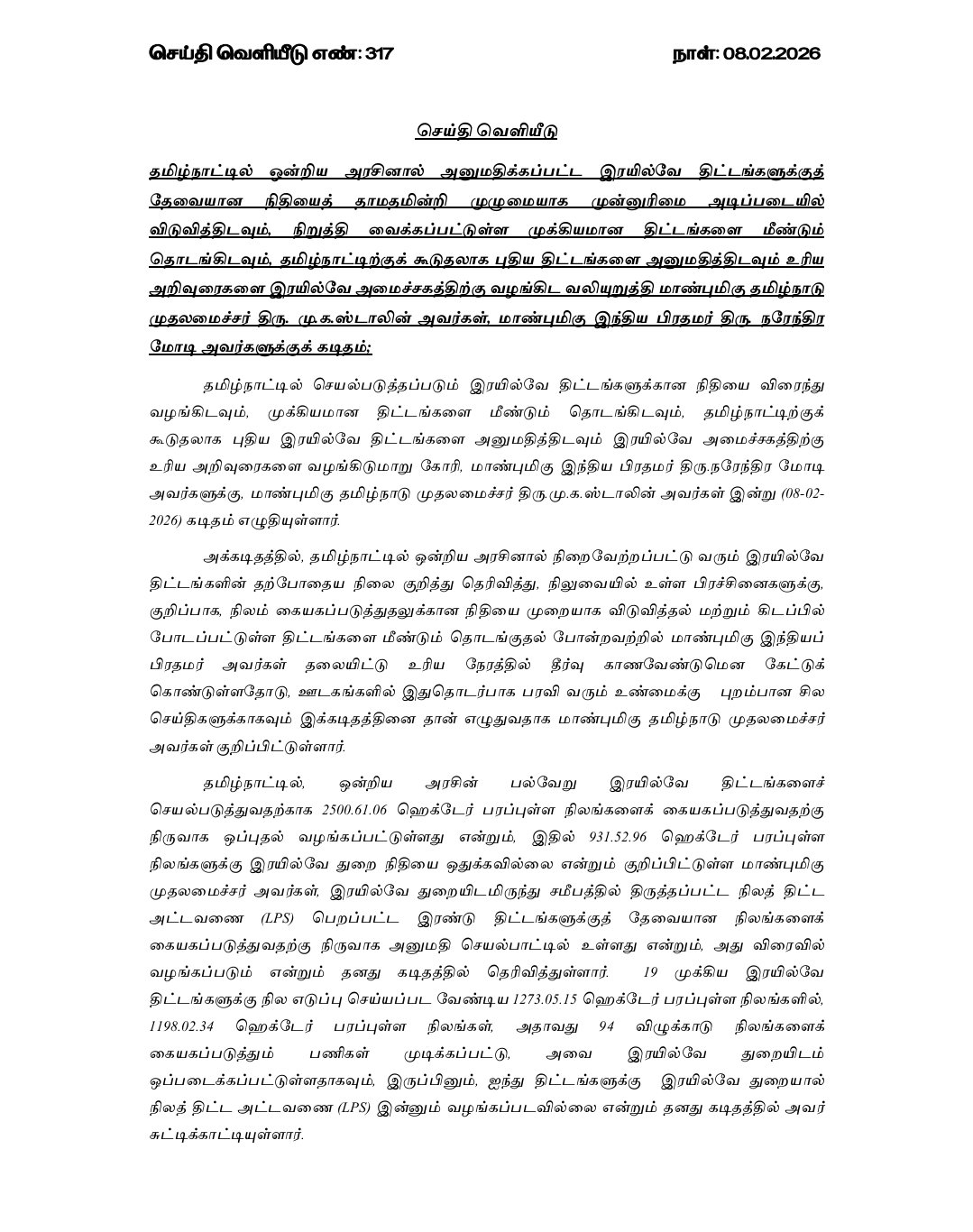 தமிழக முதலமைச்சர் மு க ஸ்டாலின் பிரதமர் நரேந்திர மோடிக்கு தமிழ்நாட்டில் ஒன்றிய அரசினர் அனுமதிக்கப்பட்ட ரயில்வே திட்டங்களுக்கு தேவையான நிதியை தாமதமின்றி முழுமையாக முன்னுரிமை அடிப்படையில் விடுவித்திடவும் நிறுத்தி வைக்கப்பட்டுள்ள முக்கியமான திட்டங்களை மீண்டும் தொடங்கிடவும் தமிழ்நாட்டிற்கு கூடுதலான புதிய திட்டங்களை அமைத்திடமும் உரிய அறிவுரைகளை ரயில்வே அமைச்சகத்திற்கு வழங்கிய வலியுறுத்தி கடிதம் எழுதியுள்ளார்.
