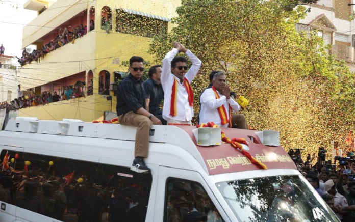 தமிழக வெற்றிக்கழக பொதுச் செயலாளர் என். ஆனந்தை ஆதரித்து தியாகராய நகரில் பிரச்சாரத்தை மேற்கொண்டார்.விஜய்.