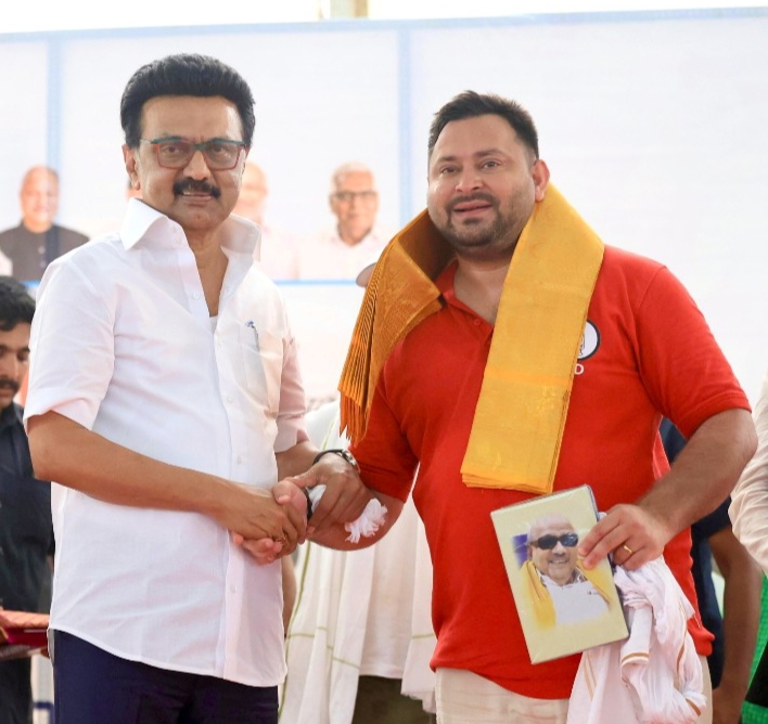 திருப்பூரில் நடைபெற்ற தேர்தல் பிரச்சாரக் கூட்டத்தில் தமிழக முதலமைச்சர் மு க ஸ்டாலின் உடன் ராஷ்டிரிய ஜனதா தள தலைவர் தேஜஸ்வி யாதவ் கலந்து கொண்டார். வேட்பாளர்களை அறிமுகம் செய்து பின்னர் உரையாற்றிய முதலமைச்சர் சமூக நீதிக்காக போராடும் கட்சிகளின் கூட்டணியாக இந்தியா கூட்டணி திகழ்வது ஆகவும் நாட்டை பிளவுபடுத்தும் சக்திகளை வீழ்த்தி ஒன்றிணைந்துள்ளதாககுறிப்பிட்டார். ஒன்றிய இந்திய அரசின் தவறான பொருளாதார கொள்கைகள் திருப்பூர் போன்ற மேற்கு மண்டலத்தின் தொழில் வளர்ச்சியை பாதித்துள்ளதாகவும் குற்றம் சாட்டினார். தமிழ்நாட்டுக்கு வருக சகோதரர் என தேஜஸ்வீ வரவேற்ற முதலமைச்சர் பெரியார் மற்றும் கர்ப்பூரி தாகூர் ஆகியோரின் வழிகாட்டுதலில் இந்த கூட்டணி பீகார் முதல் தமிழ்நாடு வரை வலுவாக இருப்பதாகவும் தெரிவித்தார் .பெண்களுக்கான இட ஒதுக்கீடு மற்றும் பல்வேறு மக்கள நலத்திட்டங்களை செயல்படுத்துவதில் திமுக அரசு முன்னணியில் இருப்பதை சுட்டிக்காட்டியதுடன் பிளவு படுத்தும் அரசியலில் முறியடிக்க வாக்களிக்கு மாறும் வேண்டுகோள் விடுத்தார்.. கூட்டத்தில் தேஜஸ்வி யாதவ் பேசிய தமிழ்நாடு மனித வள மேம்பாட்டு குறியீட்டில் முதலிடத்தில் இருப்பதையும் முதலமைச்சர் ஸ்டாலின் சிறப்பான ஆட்சியைபாராட்டி வெகுவாக புகழ்ந்தார்.